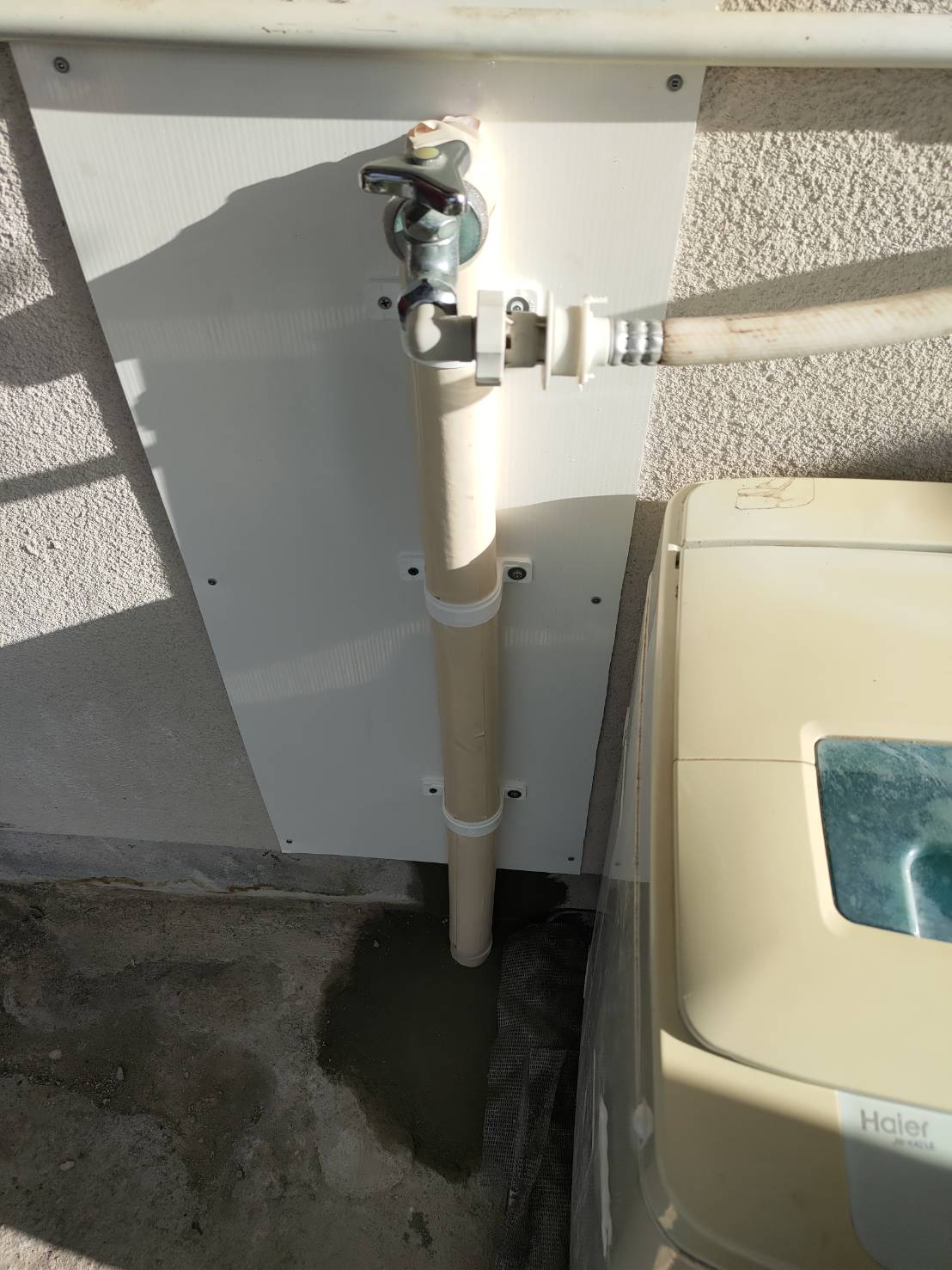 現場に行ってみると外に置いてある洗濯機水栓の下側から水漏れをしていました。